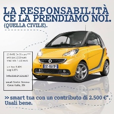 Spot lecito o ingannevole? È quanto si domanda Codici nei confronti della recente pubblicità della Smart, che recita: “La responsabilità ce la prendiamo noi (quella civile)” e “Contributo assicurazione di 2500 euro”. Sembra infatti, dalla promozione sui cartelloni, alla radio o in internet, che nell’acquisto del veicolo sia ricompresa l’assicurazione per la responsabilità civile. “La realtà non è assolutamente così – spiega l’associazione – Il consumatore che si reca presso la concessionaria/rivenditore autorizzato, in sede di stipula del contratto si trova infatti a verificare l’assenza di qualsivoglia servizio di copertura assicurativa, trattandosi in realtà di una più generica promozione basata su di un asserito prezzo di listino (non verificabile ed in ogni caso predeterminato)”.