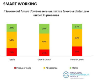 Il lavoro del futuro dovrà essere un mix tra lavoro a distanza e lavoro in presenza. Oltre il 70% degli intervistati dalla Fondazione per la Sostenibilità digitale pensa che lo smart working sia un vantaggio non solo per il work life balance, la produttività e le donne, ma anche per l’ambiente