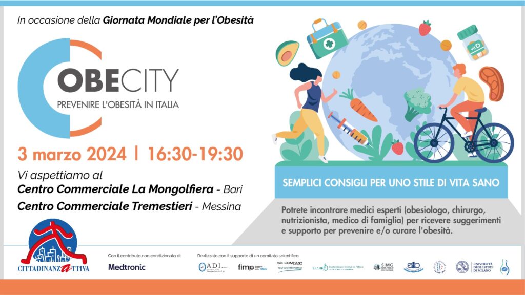 In occasione della Giornata Mondiale dell’Obesità, prevista per il 4 marzo, Cittadinanzattiva lancia infatti l’iniziativa ObeCity edizione 2024. L’obiettivo? Informare i cittadini su fattori di rischio, stili di vita e alimentazione sana. L’evento si focalizzerà sulla sensibilizzazione e sull’informazione di questa patologia rivolgendosi in particolare ai cittadini di Bari e Messina. Per maggiori informazioni sull’evento è possibile consultare direttamente il seguente sito: https://www.cittadinanzattiva.it/notizie/16297-obecity-2024-vi-aspetta-a-bari-e-messina-domenica-3-marzo.html