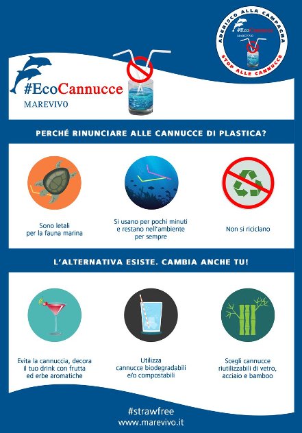 La campagna #Ecocannucce, lanciata da Marevivo, ha ottenuto in pochi mesi centinaia di adesioni tra esercenti, festival musicali, discoteche, comuni, alberghi e stabilimenti balneari. “Anche VyTA Retail food, il Consorzio Costa Smeralda, il gruppo Caronte & Tourist – Siremar, la Compagnia dei Caraibi, Ecozema, il Comune di Senigallia, di Lampedusa e Linosa, di Spotorno, in provincia di Savona, sostengono l’iniziativa – spiega Marevivo – La mobilitazione è partita anche alle isole Eolie grazie all’impegno di Aeolian Islands Preservation Fund e di Verdeolie: Isole Senza Plastica che hanno già coinvolto a Panarea: il Bar del Porto, Bar da Carola, Bridge Sushi Bar, Paki Bar, Banacalii Bar, Raya, Ristorante da l’Eoliano, Rosticceria Gastronomia Da Claudia; a Salina: Ristorante Franco Manca e a Lipari: Il Giardino di Lipari. Solo a Panarea sono state già eliminate 20.000 cannucce”. Sul web l’associazione ha poi lanciato l’hashtag #RifiutaLaCannuccia per spingere gli utenti a condividere sui social un selfie con il proprio drink senza cannuccia. Le alternative ci sono: quando servono, per motivi medici o altre ragioni, si possono usare cannucce biodegradabili o cannucce riutilizzabili in vetro, acciaio o bambù.