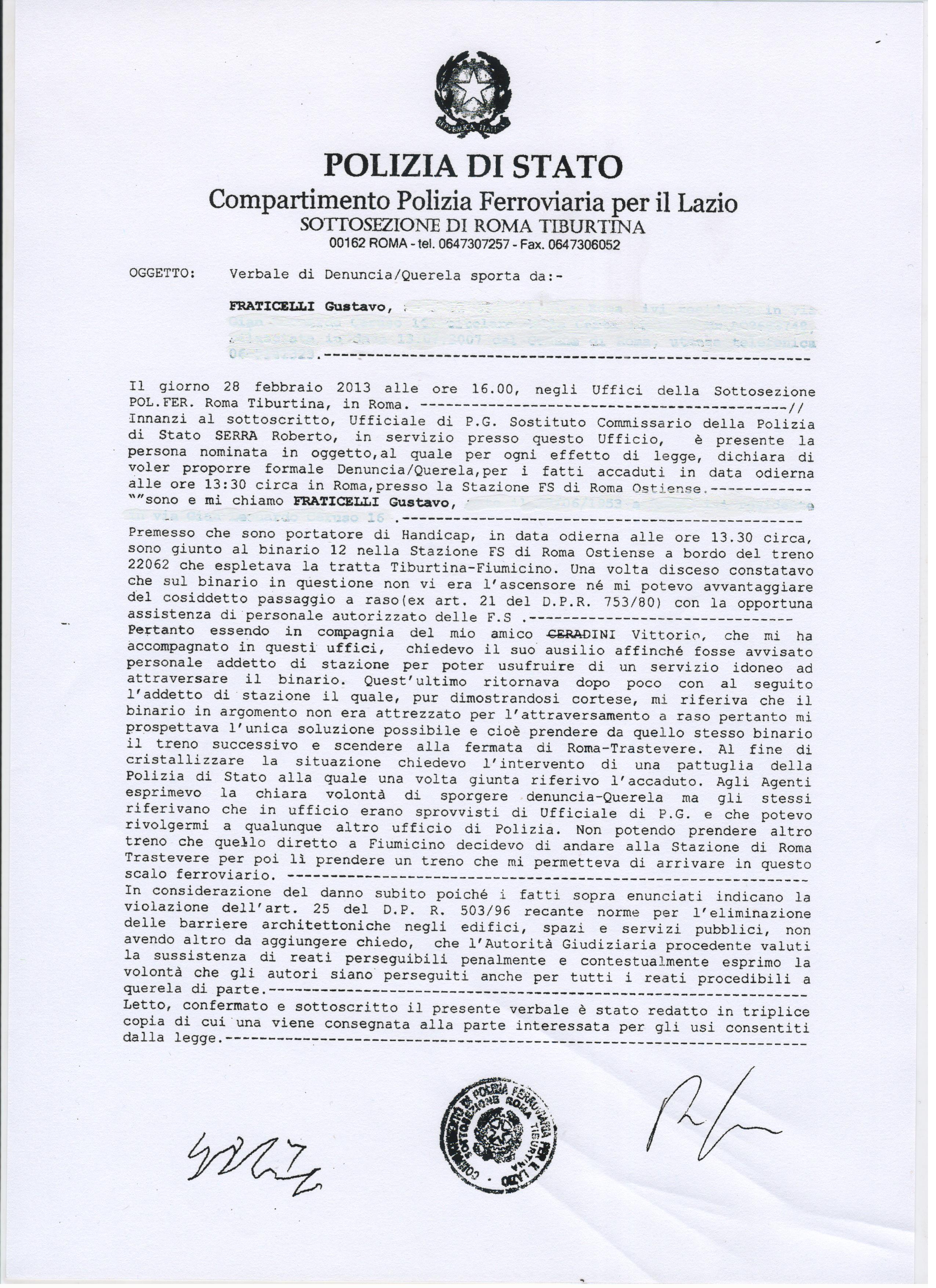 Constatata la situazione anche con gli agenti della polizia ferroviaria, Fraticelli ha presentato un esposto, a cui seguirà l’avvio di un procedimento civile a carico di Ferrovie dello Stato per atti discriminatori nei confronti dei disabili. “Oltre ai binari morti, alla Stazione Ostiense ci sono anche i marciapiedi morti – scrive Fraticelli – quale quello numero 12, dove, una volta sceso dal treno, non potevo con la sedia a rotelle accedere ad alcunché se non risalire su di successivo treno metropolitano”.