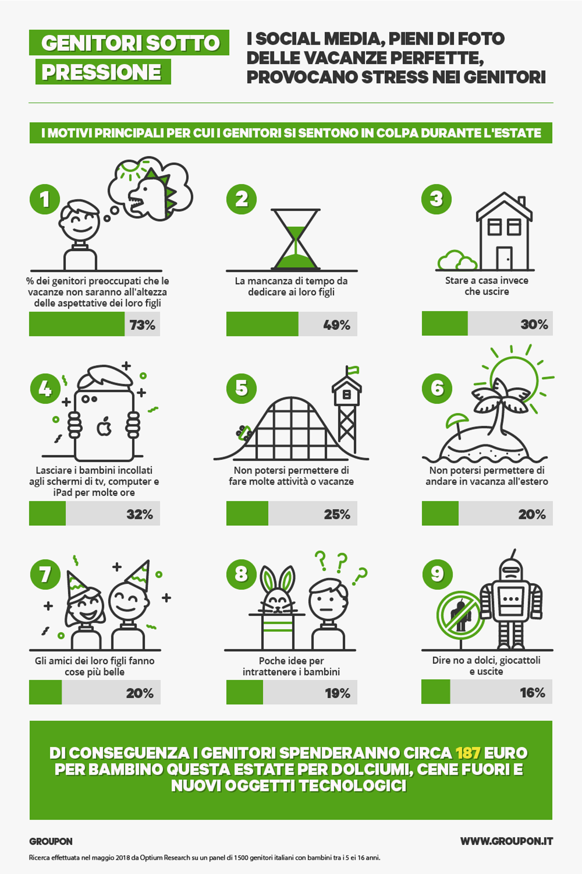 Lo rivela una ricerca interazionale condotta da Groupon secondo la quale tra i fattori principali che scatenano l’ansia dei genitori ci sono i tanto amati/odiati social media: il 28% delle mamme e papà italiani dichiara di sentirsi sotto pressione ad ogni post sui social che raffigura l’estate perfetta.