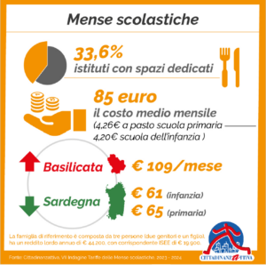 In media, 84 euro al mese nell’anno scolastico in corso per la mensa di un bambino iscritto alla scuola dell’infanzia, pari a 4,20 euro a pasto. E 85 euro al mese per chi è iscritto alla primaria, con una media di 4,26 euro a pasto. Ma le regioni e le città hanno una grande variabilità di tariffe fra loro. Accade dunque che la regione più costosa sia la Basilicata con 109 euro mensili mentre quella più economica la Sardegna (61 euro al mese nell’infanzia e 65 euro per la primaria).