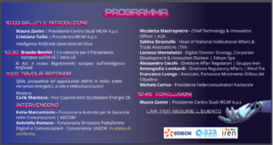 Introduzione Presidenza IRCAF, relazione introduttiva a cura di Brando Benifei co-relatore per il parlamento europeo sull’AI ACT UE, a seguire ci sarà una tavola rotonda alla quale prenderanno parte rappresentanti delle Autorithy, delle aziende energetiche, dei servizi a rete, delle telecomunicazioni e delle associazioni nazionali dei consumatori. E’ possibile seguire l’evento collegandosi al canale YouTube del centro studi IRCAF cliccando sul link posto sulla locandina.