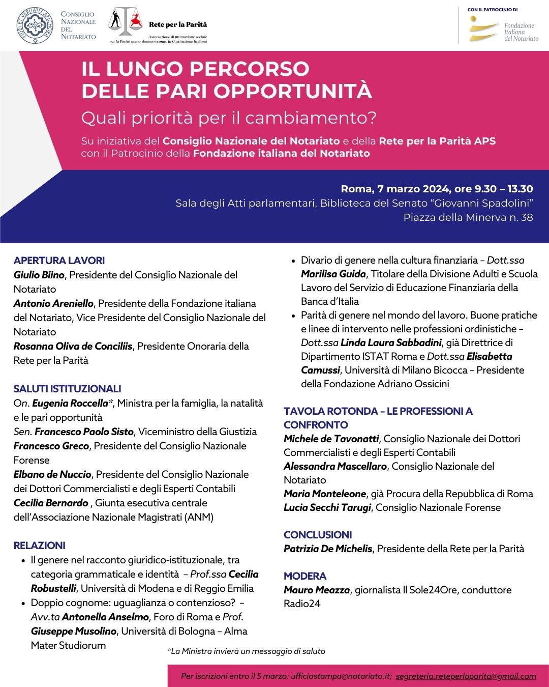 Si terrà il prossimo 7 marzo a Roma, presso la Sala degli Atti parlamentari della Biblioteca del Senato “Giovanni Spadolini” (Piazza della Minerva 38) il convegno “Il lungo percorso delle pari opportunità. Quali priorità per il cambiamento?” organizzato dal Consiglio Nazionale del Notariato e dall’Associazione Rete per la Parità per fare il punto, insieme con i rappresentanti della politica, delle istituzioni, del mondo accademico e delle professioni, sui traguardi raggiunti e sulle riforme e interventi ancora necessari per rendere la parità di genere effettiva nella società civile.