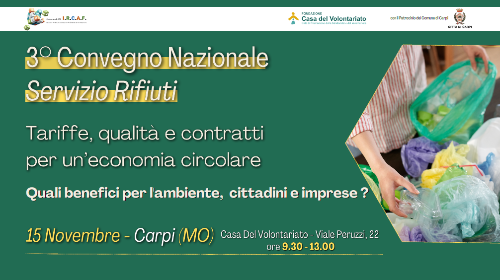 Nell’ambito del progetto annuale “Seminare Futuro 2023”, il Centro Studi IRCAF a.p.s. organizza il convegno “Servizio rifiuti. Tariffe, qualità e contratti per un’economia circolare. Quali benefici per l’ambiente, cittadini e imprese?