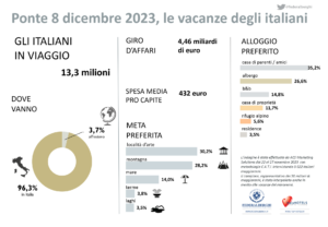 La spesa media complessiva a persona per questo ponte è di circa 432 euro, con un giro di affari di 4 miliardi e 461 milioni di euro (+7,6% rispetto al 2022).