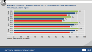 Dal 1998, quando ha iniziato a rilevare i comportamenti e le opinioni delle famiglie sulla raccolta differenziata, «la percentuale di famiglie che dichiarano di effettuare “sempre” la differenziazione di tutti i tipi di rifiuti ha registrato un aumento costante, per effetto sia dei provvedimenti normativi sia della crescente sensibilità ambientale».