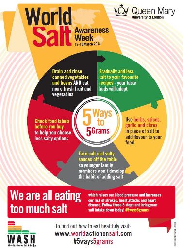 La settimana è promossa dalla World Action on Salt & Health (WASH), associazione con partner in 100 Paesi, istituita nel 2005 per migliorare la salute delle popolazioni attraverso la graduale riduzione dell’introito di sodio.