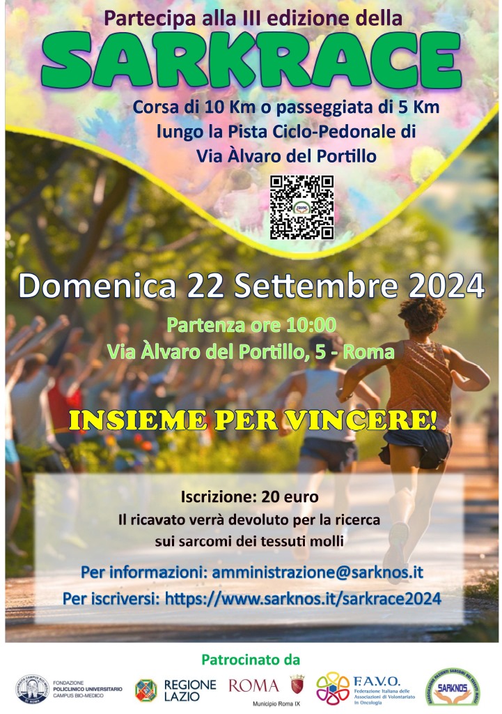 A organizzare la Sarkrace è Sarknos (Associazione Pazienti Sarcomi dei Tessuti Molli) in collaborazione con la Fondazione Policlinico Universitario Campus Bio-Medico e il patrocinio della Regione Lazio, del Municipio IX di Roma Capitale e di F.A.V.O. (Federazione Italiana delle Associazioni di Volontariato in Oncologia). L’appuntamento è per domenica 22 settembre 2024, con partenza alle 10,00 da via Àlvaro del Portillo, 5, presso la Fondazione Policlinico Universitario Campus Bio-Medico.