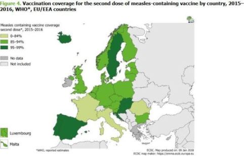 Il rapporto annovera complessivamente 14.393 casi di morbillo registrati lo scorso anno, di cui 4.985 solo in Italia, il 35% del totale. L’Italia è ai primi posti fra gli Stati col più alto tasso di casi di morbillo: dopo la Romania, che conta 5966 casi, e prima di Germania e Grecia, che segnalano rispettivamente 937 e 625 casi. La copertura vaccinale non è ottimale in tutti gli Stati. Secondo l’Organizzazione mondiale della sanità, nel periodo 2015-2016 in 20 Paesi su 27 la percentuale di vaccinati con seconda dose è al di sotto del target considerato sicuro per interrompere la diffusione della malattia, ovvero il 95%. E l’Italia, ancora una volta, non può vantare un buon risultato, essendo al di sotto dell’84%.