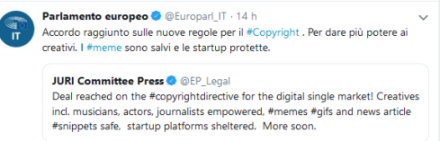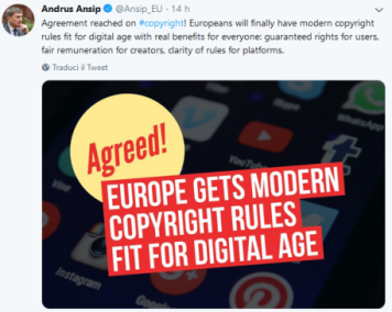Un provvedimento molto contestato, che contrappone da un lato le richieste di editori e stampa, dall’altro quelle delle piattaforme e di quanti in diverso modo paventano rischi per la libertà sulla quale è fondata la Rete. Dalle istituzioni europee c’è soddisfazione. Si legge in un tweet del Parlamento europeo:  “Accordo raggiunto sulle nuove regole per il . Per dare più potere ai creativi. I sono salvi e le startup protette”. La riforma vanta dunque “più potere ai creativi e tutela della libertà di espressione”. Ha scritto su twitter Andrus Ansip, vice presidente della Commissione Ue al Digital Single Market: “Accordo raggiunto su #copyright! Gli europei avranno finalmente regole di copyright moderne adatte per l’era digitale con vantaggi reali per tutti: diritti garantiti per gli utenti, remunerazione equa per i creatori, chiarezza delle regole per le piattaforme”.