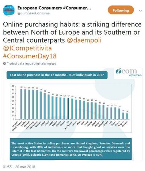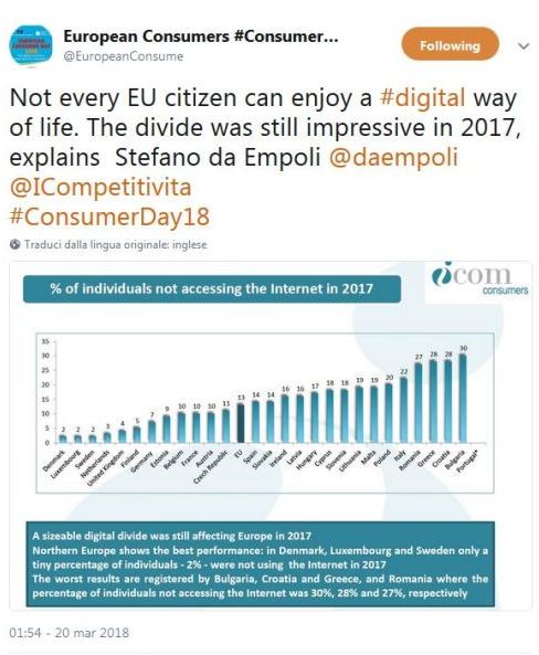 Le dimensioni e le ripercussioni della vita digitale per i consumatori sono tantissime e a Sofia se ne parlerà ampiamente. Alcuni dati, però, vanno forse sottolineati per comprendere come l’Europa stia affrontando e vivendo una sfida importante con realtà profondamente diverse da Stato a Stato. I numeri sono stati diffusi questa mattina da Stefano da Empoli, presidente di  I-Com (Istituto per la competitività) e rilanciati dal profilo twitter della Giornata europea del Consumatore 2018.