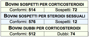 tabella-steroidi-carneCome spiega il Fatto Alimentare (dal quale è tratta la tabella a lato) dai rilevamenti fatti in 18 Regioni “risulta che 72 bovini rispetto ad un totale di 514 sono stati classificati come “sospetti” per la presenza di corticosteroidi. Per quanto riguarda il trattamento illecito con ormoni steroidei sessuali i casi “sospetti” sono stati 12 rispetto a un totale di 576 capi esaminati. L’ultimo dato riguarda i casi “dubbi” per trattamento illecito a base di corticosteroidi: 74 su 512 capi”.