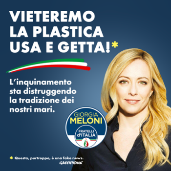 Anche perché lotta al cambiamento climatico e attenzione all’ambiente non sono certo al primo posto dei temi di questa campagna elettorale. Spiega Greenpeace: “Circolano sui social network le immagini elettorali di sette tra i principali leader politici, con messaggi che appaiono davvero molto ambientalisti. Purtroppo non è un cambiamento di rotta, ma una campagna di comunicazione di Greenpeace, com’è chiaro dal disclaimer: “questa è una fake news”.