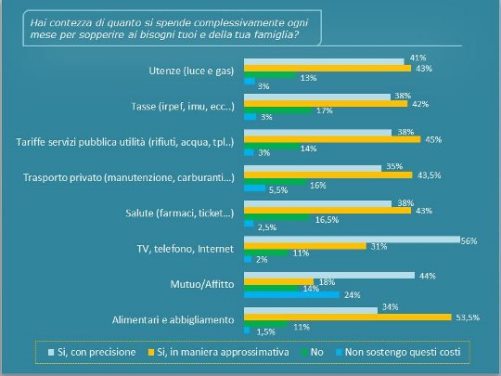 Il bilancio familiare ha una certa dose di oscurità. La maggior parte delle spese sono note in modo approssimativo, che siano luce e gas, tasse e tariffe, spese per la salute, per cibo e abbigliamento. E la cultura finanziaria e assicurativa latita, tanto che la metà degli intervistati considera scarse o pessime le proprie conoscenze. La consultazione civica svolta da Cittadinanzattiva su un campione di 1500 cittadini restituisce la difficoltà a misurarsi con bilancio familiare, risparmi, voci di spesa, economia e finanza. Solo poco più di un cittadino su tre conosce con precisione a quanto ammontano le proprie spese mensili. La metà le conosce in maniera approssimativa e una percentuale non irrilevante, che oscilla fra l’11% e il 17%, non lo sa per nulla.