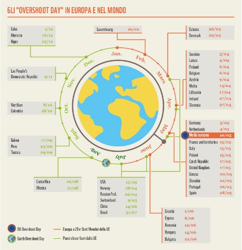 Una data che cade in giorni diversi a seconda del paese cui ci si riferisce e dello stile di vita. In Europa è il 10 maggio, in Italia l’esaurimento delle risorse naturali scatterà dal 15 maggio, negli Stati Uniti le risorse naturali sono già state consumate il 15 marzo. Si usa insomma più risorse di quanto la terra metta a disposizione. Attualmente l’umanità tutta intera usa le risorse biologiche di 1,7 pianeti e il “sorpasso” accade perché si tagliano gli alberi prima che crescano, si pesca più pesce di quanto l’ecosistema degli oceani sia in grado di rigenerare, si emette più carbonio in atmosfera di quanto foreste e oceani siano in grado di assorbire. Un consumo di risorse e un eccesso partito, secondo i calcoli del Global Footprint Network, dal 1970.
