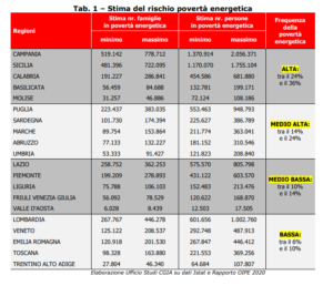 «In termini assoluti è la Campania la regione maggiormente in difficoltà: il numero delle famiglie che utilizza saltuariamente luce e gas oscilla tra le 519 mila e le 779 mila unità. Altrettanto critica è la situazione in Sicilia dove la forchetta oscilla tra i 481 mila e i 722 mila nuclei familiari e in Calabria che presenta un range tra le 191 mila e le 287 mila famiglie in difficoltà nell’utilizzo quotidiano di energia elettrica e metano».