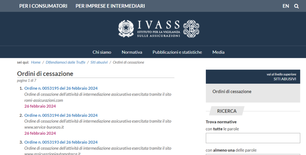 Prosegue l’azione dell’Istituto per la vigilanza sulle assicurazioni (Ivass) nei confronti dei servizi abusivi. L’Ivass ha infatti ordinato la cessazione dell’attività di intermediazione assicurativa esercitata attraverso altri 9 siti web che offrono abusivamente servizi assicurativi: agenzia-valli.it; www.bonettiassicurazioni.com; www.assicurazioniautomotorca.it; www.service-buronzo.it; romi-assicurazioni.com; csaassicura.com; www.assgalleni.it; assi-morelli.com; prima-promo-amico.com.