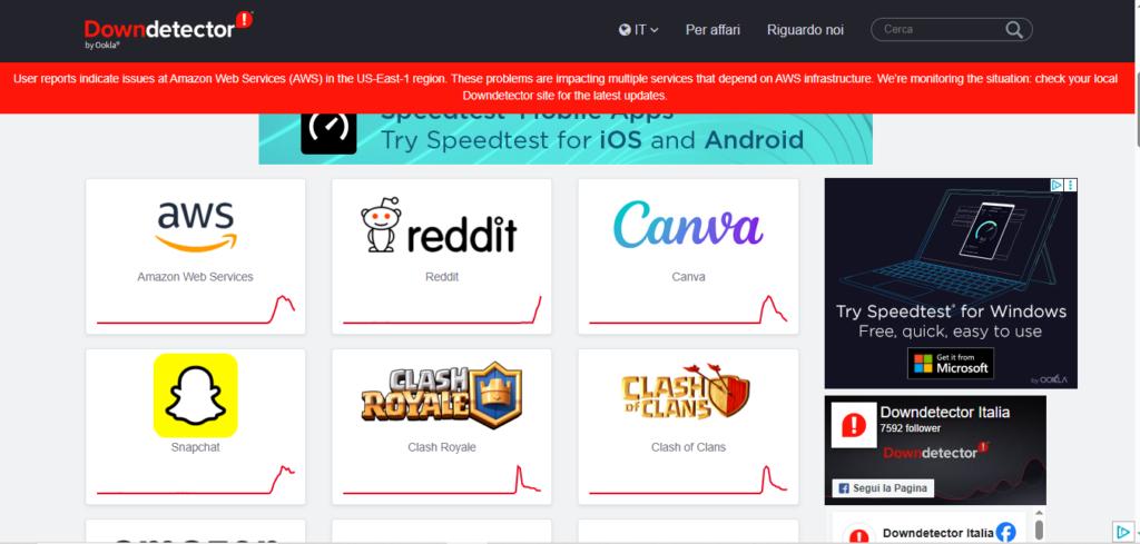 I problemi di connessione coinvolgono anche l’Italia. I malfunzionamenti riguardano fra gli altri Canva, Perplexity e le piattaforme di gaming Roblox, Clash Royale, Clash of Clans e Brawl Stars. In Italia le segnalazioni di problemi con Amazon Web Services (AWS) e app in down sono iniziate intorno alle 9 di questa mattina; gli utenti segnalano criticità su Reddit, Canva, sui videogiochi Clash Royale e Fortnite; segnalati anche malfunzionamenti con la stessa piattaforma di ecommerce Amazon.