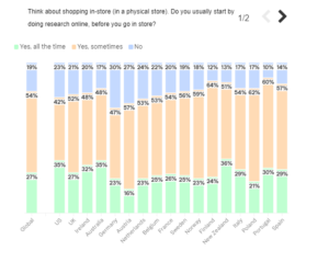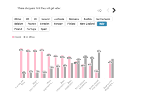 La rivoluzione digitale poi non significa solo che i consumatori comprano più spesso online, perché prima di acquistare fanno ricerche online sui prodotti cui sono interessati. Prima di andare in negozio, i clienti cercano prodotti e prezzi online. In l’Italia il 29% dei consumatori intervistati dice di fare sempre ricerche online prima di andare in negozio, il 54% risponde “qualche volta” e solo il 17% dà una risposta negativa. La media globale è rispettivamente del 27%, 54% e 19%.