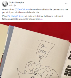 Incontri definitivi: Giulia Ciarapica, nota book blogger, oltre che autrice e critica letteraria, ha fatto la fila per incontrare Zerocalcare, e poco dopo, in un post ha scritto “è l’uomo della mia vita!