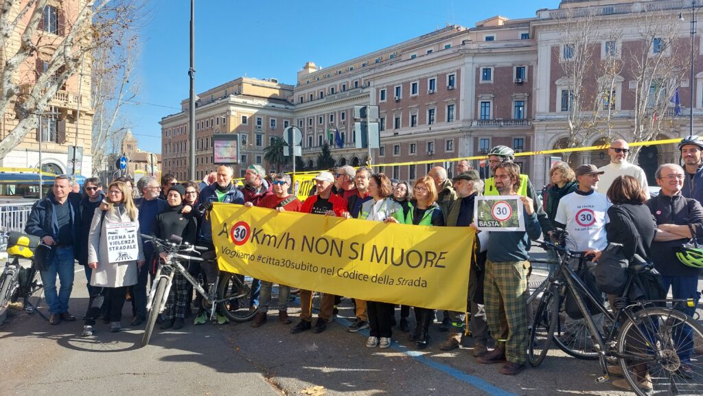 “A 30Km/h non si muore. Vogliamo #Città30subito nel Codice della Strada”. È lo striscione che la piattaforma #Citta30Subito ha portato in presidio sotto il Ministero dei Trasporti per esprimere la sua opposizione a una riforma del Codice della Strada senza moderazione della velocità e per dire no alla direttiva contro le città30 del Ministro dei Trasporti Matteo Salvini – direttiva che in premessa, analizza la Federazione ambiente e bicicletta, risulta “inapplicabile” perché né a Bologna appena diventata Città30 né nelle altre città “viene mai adottato il limite generalizzato a 30 km/h, ma sempre viene bilanciato tra strade alle quali si applica e strade il cui limite resta 50 km/h. Il Ministro non considera che dal 1995 vengono legittimamente realizzate in Italia le Zone 30, aree delle città a 30 km/h inserite in un reticolo di strade a 50 km/h”.